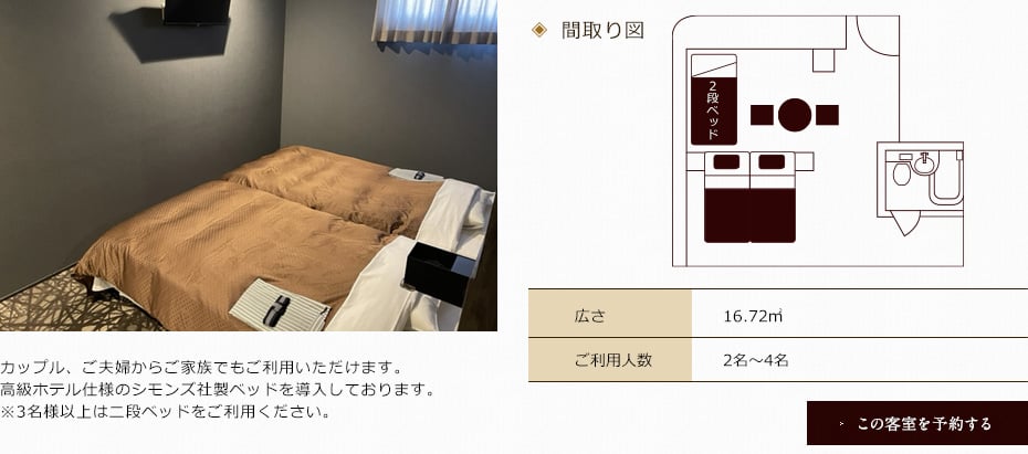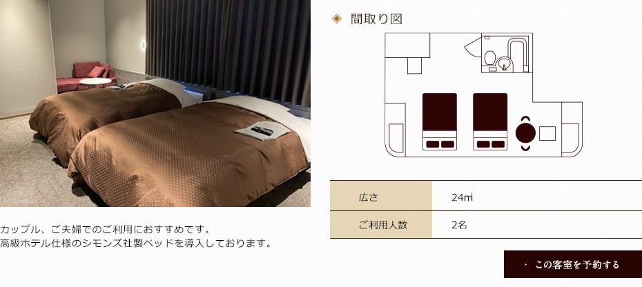 お客様にお寛ぎいただけるよう、寝心地を追求した高級ホテル仕様シモンズ社製のベッドを全洋室に導入いたしました。
